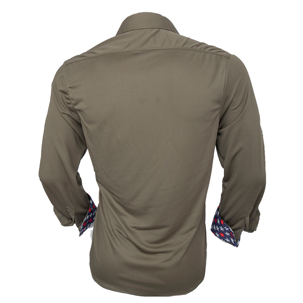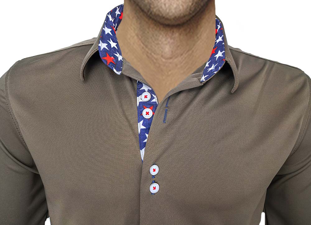 Anton Alexander American Flag Dress Shirts are designed and made in the USA with great pride. Anton Alexander shirts are available in two different types, slim fit, and modern fit. These American Flag Dress Shirts are made with army green moisture wicking fabric with star accent. The fabric is ultra light, easy care, and wrinkle-free. This new innovative fabric technology gives you many great benefits. Not only is it breathable for hot days, but it also has moisture wicking technology. This eliminates the concept of sweaty armpits. The unique fabric blend is also wrinkle-free and super easy care. The entire shirt weighs less than 9oz. The design has contrast stitching over contrast fabrics and buttonholes. Every shirt has a unique silver ring double button design with double purl stitched buttonholes.