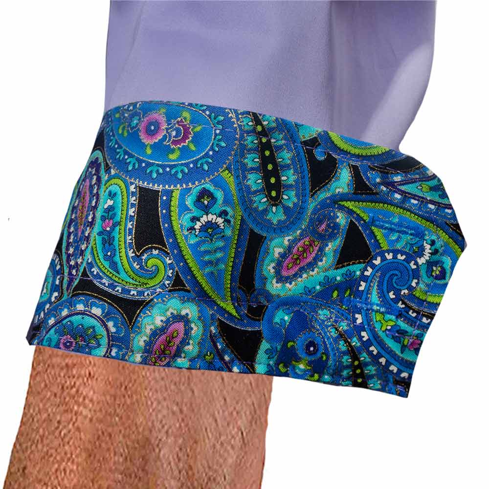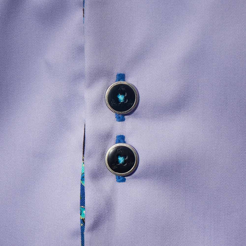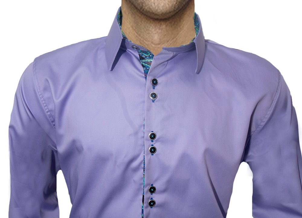 Anton Alexander Amethyst Dress Shirts are destined to be among the finest in menswear. Available in both slim fit and modern fit, these shirts are crafted from light purple Italian cotton with a striking black and multi-color paisley accent fabric. The contrast stitching over the accent fabrics and buttonholes adds a unique touch, making these amethyst dress shirts stand out. Each shirt features a brushed nickel ring double button design and double purl stitched buttonholes for added durability and style.