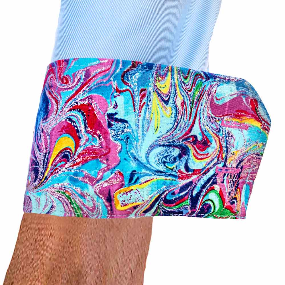 Our Baby Blue Modern Dress Shirts are destined to be among the finest among menswear. The shirts are available in two different types, slim fit, and modern fit. The Baby Blue Modern Dress Shirts are made with baby blue Italian cotton with multicolored abstract accent. There is contrast stitching over the contrast fabrics and buttonholes. Each men’s dress shirt has a unique brushed nickel double button design and double purl stitched buttonholes.