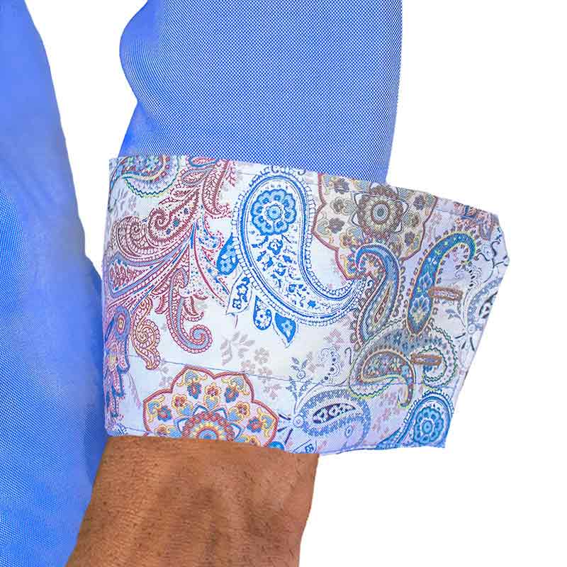 Our blue white and brown dress shirts are destined to be among the finest among menswear. The shirts are available in two different types, slim fit, and modern fit. Our blue white and brown dress shirts are an Italian fine blue oxford cotton with white and brown contrast fabric. There is contrast stitching over the contrast fabrics and buttonholes. Each men’s dress shirt has a unique brass chrome ring double button design and double purl stitched buttonholes.