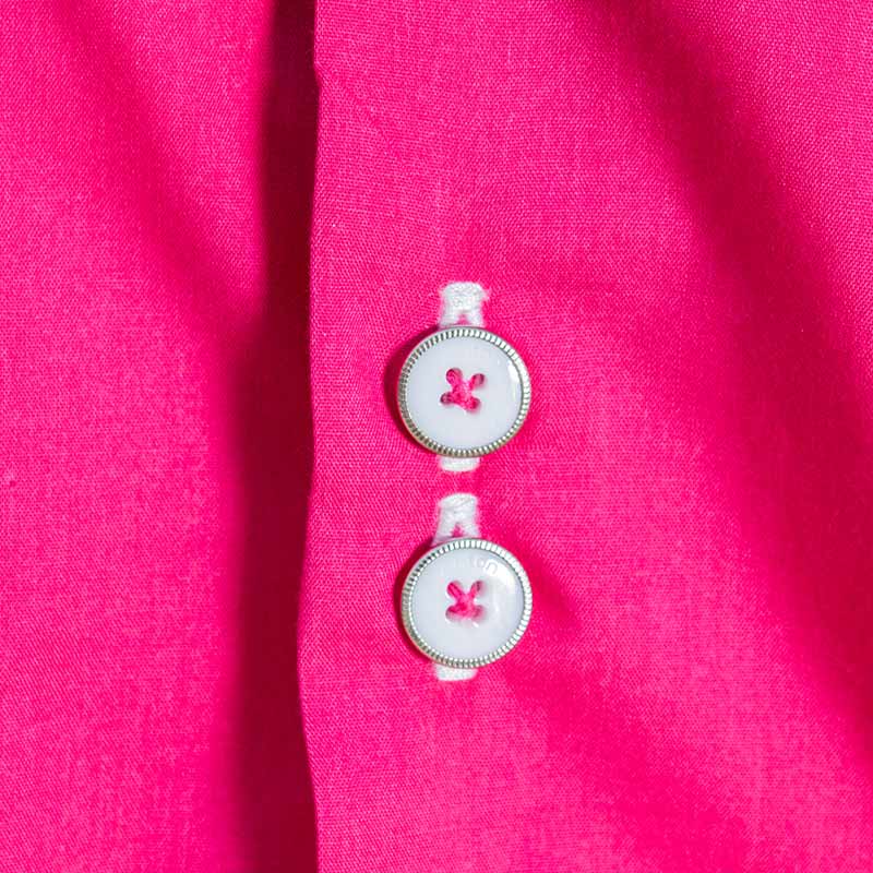 Our Bright Pink Dress Shirts are destined to be among the finest among menswear and proudly made in the USA. They are available in two different types, slim fit, and modern fit. This men’s designer dress shirt is bright pink with white contrast. There is contrast stitching over the contrast fabrics and buttonholes. Each men’s dress shirt has a unique brass chrome ring double button design and double stitched purl buttonholes.