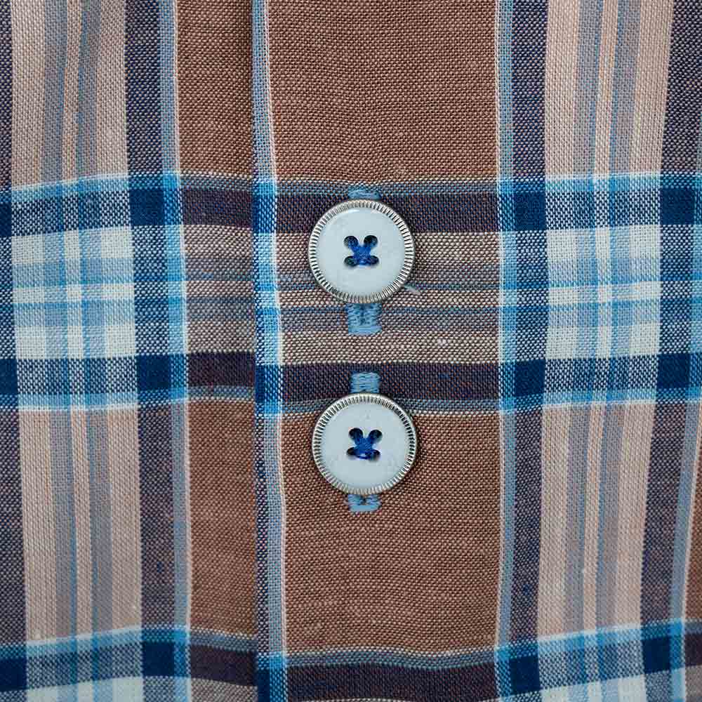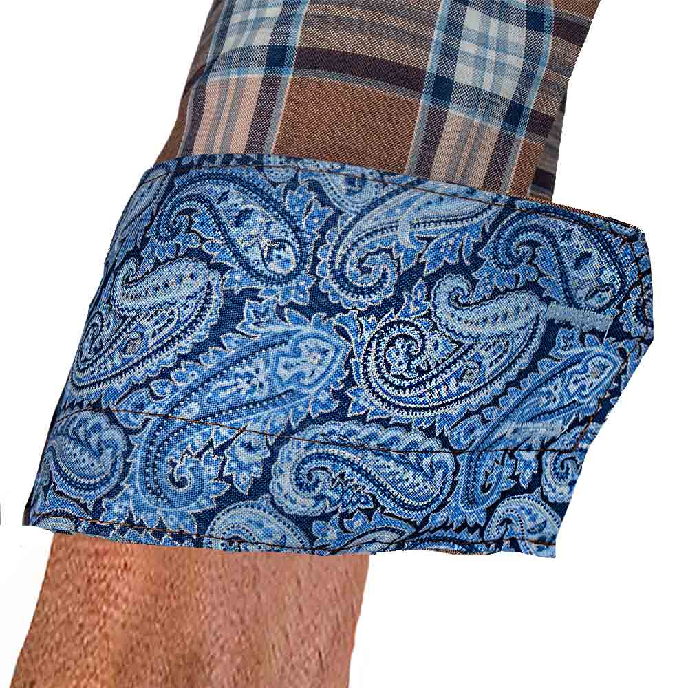 Our Brown Plaid Dress Shirts are destined to be among the finest among menswear. The shirts are available in two different types, slim fit, and modern fit. The Brown Plaid Dress Shirts are made with brown plaid Italian cotton with metallic blue paisley accent fabric. There is contrast stitching over the contrast fabrics and buttonholes. Each men’s dress shirt has a unique brushed nickel double button design and double purl stitched buttonholes.
