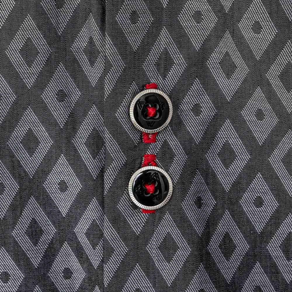 Anton Alexander Black Day of the Dead Shirts are the only designer dress shirts made for the Halloween holiday. The shirts are available in two different types, slim fit, and modern fit. Our Day of the Dead Shirts are made with Grey Italian diamond cotton with multi-colored skull Halloween contrast fabric. There is contrast stitching over the contrast fabrics and buttonholes. Each men’s dress shirt has a unique brass chrome ring double button design and double stitched purl buttonholes.