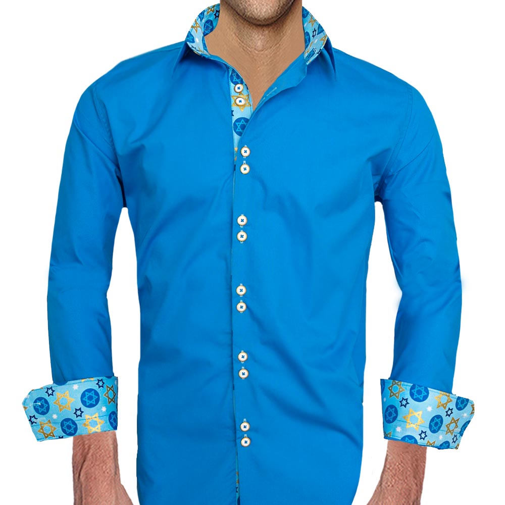 Our Dress Shirts for Hanukkah are destined to be among the finest among menswear. These Dress Shirts for Hanukkah are a blue Italian supremo cotton with Jewish themed accent fabric. Each men’s dress shirt has a unique gold ring double button design and double purl stitched buttonholes.