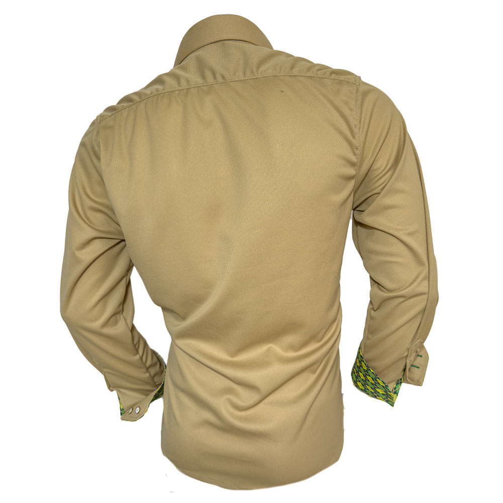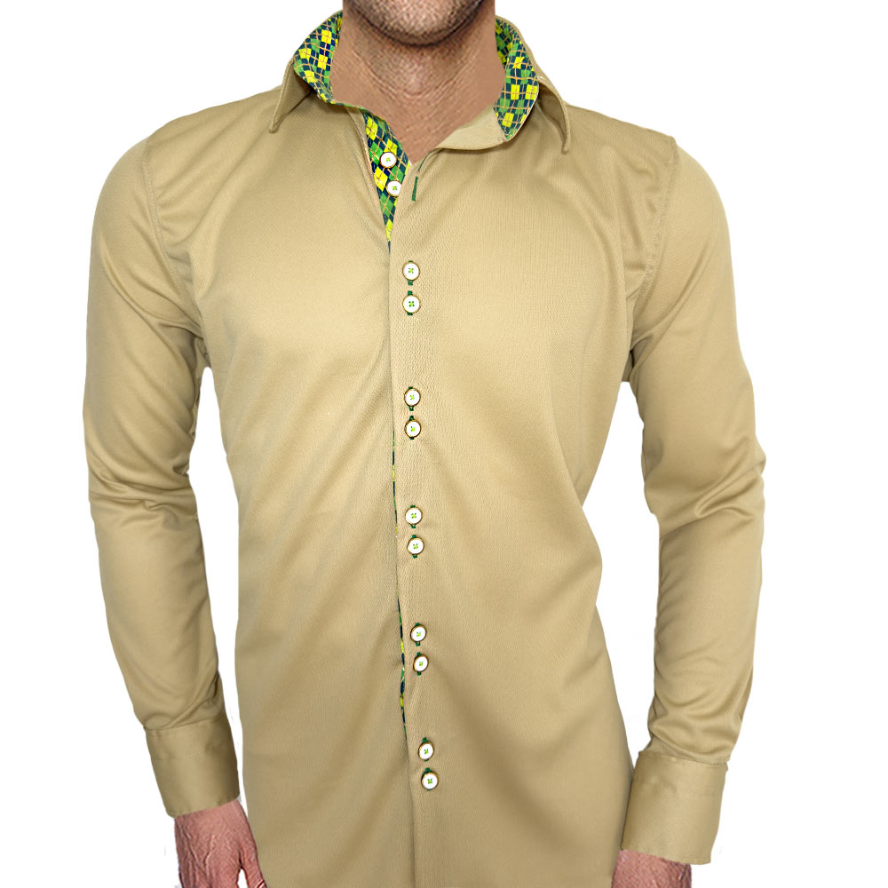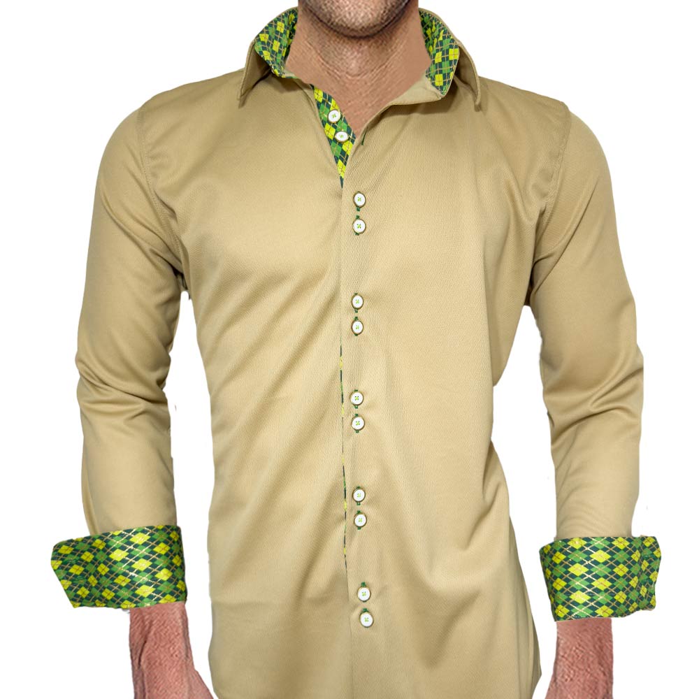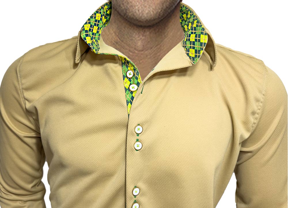 Anton Alexander Fighting Irish Mens Shirts are designed and made in the USA with great pride. Anton Alexander shirts are available in two different types, slim fit, and modern fit. These Fighting Irish Mens Shirts are made with tan moisture wicking fabric with argyle accent. The fabric is ultra light, easy care, and wrinkle-free. This new innovative fabric technology gives you many great benefits. Not only is it breathable for hot days, but it also has moisture wicking technology. This eliminates the concept of sweaty armpits. The unique fabric blend is also wrinkle-free and super easy care. The entire shirt weighs less than 9oz. The design has contrast stitching over contrast fabrics and buttonholes. Every shirt has a unique gold ring double button design with double purl stitched buttonholes.