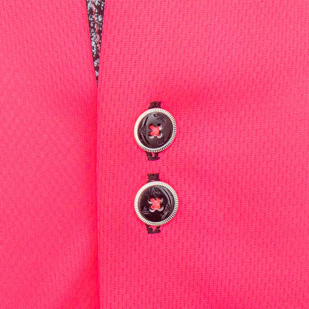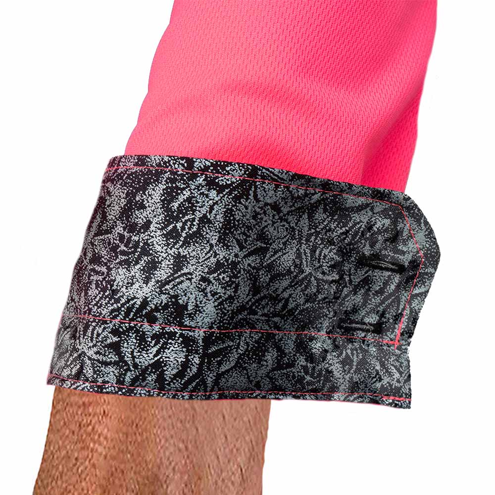 - Neon pink moisture-wicking main shirting fabric.