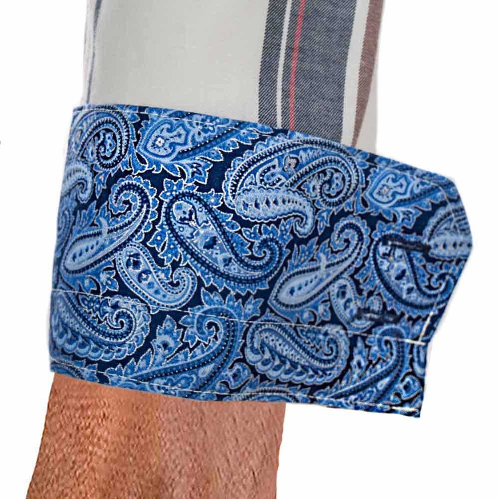 Our Mens Tan Plaid Shirts are destined to be among the finest among menswear. The shirts are available in two different types, slim fit, and modern fit. The Mens Tan Plaid Shirts are made with tan plaid Italian cotton with blue metallic paisley accent. There is contrast stitching over the contrast fabrics and buttonholes. Each men’s dress shirt has a unique gold nickel plated double button design and double purl stitched buttonholes.