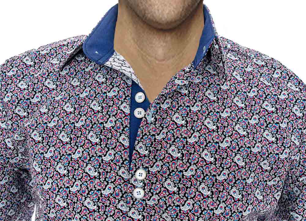 Our Paisley Mens Shirts are destined to be among the finest among menswear. The shirts are available in two different types, slim fit, and modern fit. The Paisley Mens Shirts are made with multi-colored Italian digital print cotton with solid blue accent fabric. There is contrast stitching over the contrast fabrics and buttonholes. Each men’s dress shirt has a unique brushed nickel double button design and double purl stitched buttonholes.
