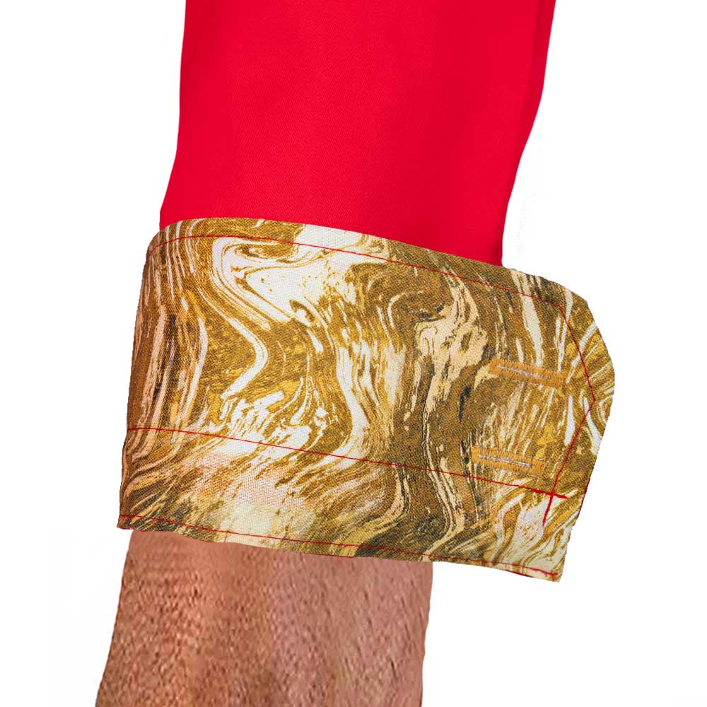 Our Red and Gold Shirts are destined to be among the finest among menswear. The shirts are available in two different types, slim fit, and modern fit. The Red and Gold Shirts are made with red Italian cotton with gold swirl accent. There is contrast stitching over the contrast fabrics and buttonholes. Each men’s dress shirt has a unique nickel plated double button design and double purl stitched buttonholes.