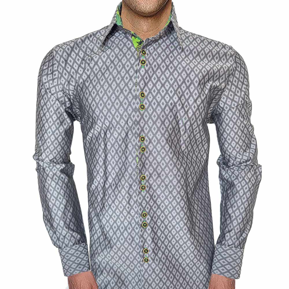 Our St Patricks Day Button Down Shirts are destined to be among the finest among menswear. This style of designer dress shirt made specifically for St. Patrick’s Holiday. The shirts are available in two different types, slim fit, and modern fit. Our St Patricks Day Button Down Shirts are grey Italian cotton with clovers as the accent fabric. Each men’s dress shirt has a unique gold ring double button design and double purl stitched buttonholes.