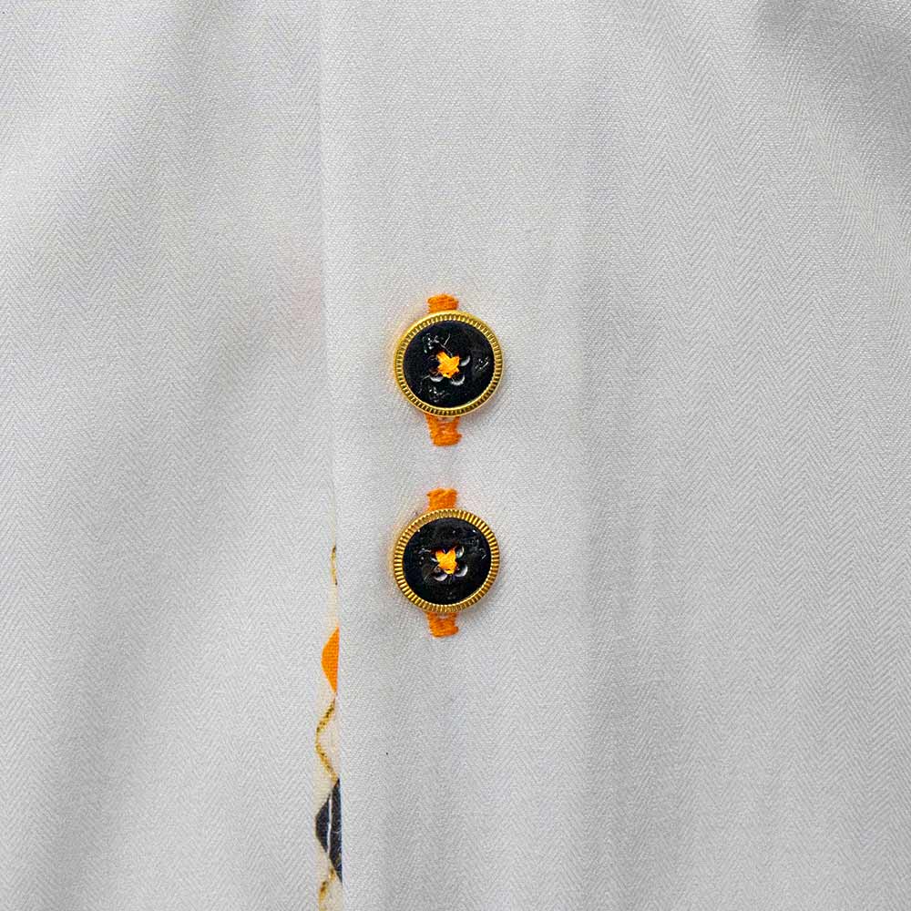 Our White Orange and Black Mens Shirts are available in two tailored styles to suit your preference: slim fit and modern fit. Each Anton Alexander men’s shirt is designed with a unique white twill base enhanced by an orange, black, and metallic plaid accent, providing a touch of elegance that sets these shirts apart from the rest. The detailed contrast stitching on the fabric accents and buttonholes adds a layer of sophistication to the shirt’s design.