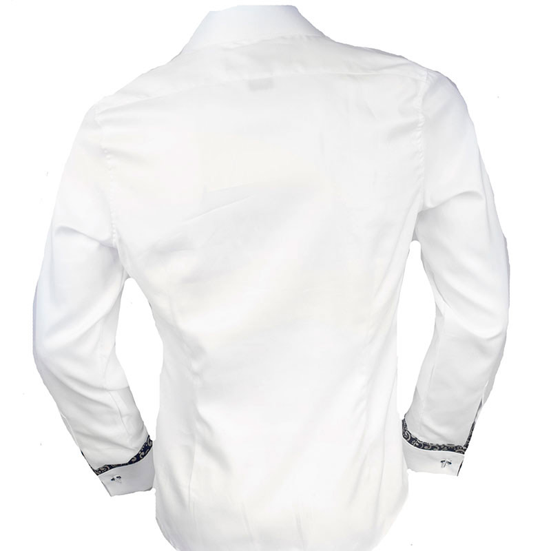The white with black and gold metallic dress shirts are uniquely crafted with metallic paisley contrast print. Our Shirts are also proudly made in the USA. They are available in two different types, slim fit, and modern fit. These white with black and gold metallic dress shirts are made with Italian herringbone cotton. The French cuffs also come with chrome cufflinks. There is contrast stitching over the contrast fabrics and buttonholes. Each men’s dress shirt has a unique brass chrome ring double button design and double purl stitched buttonholes.