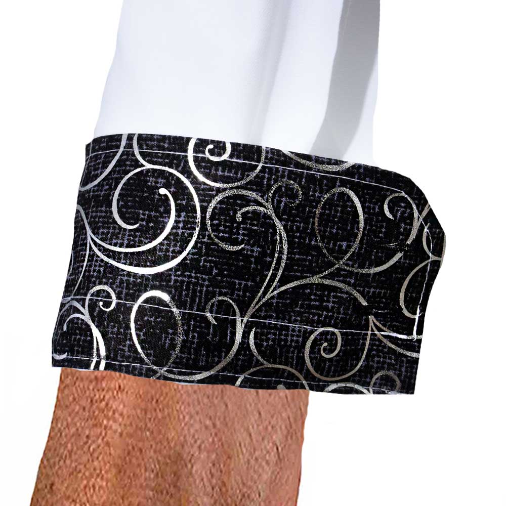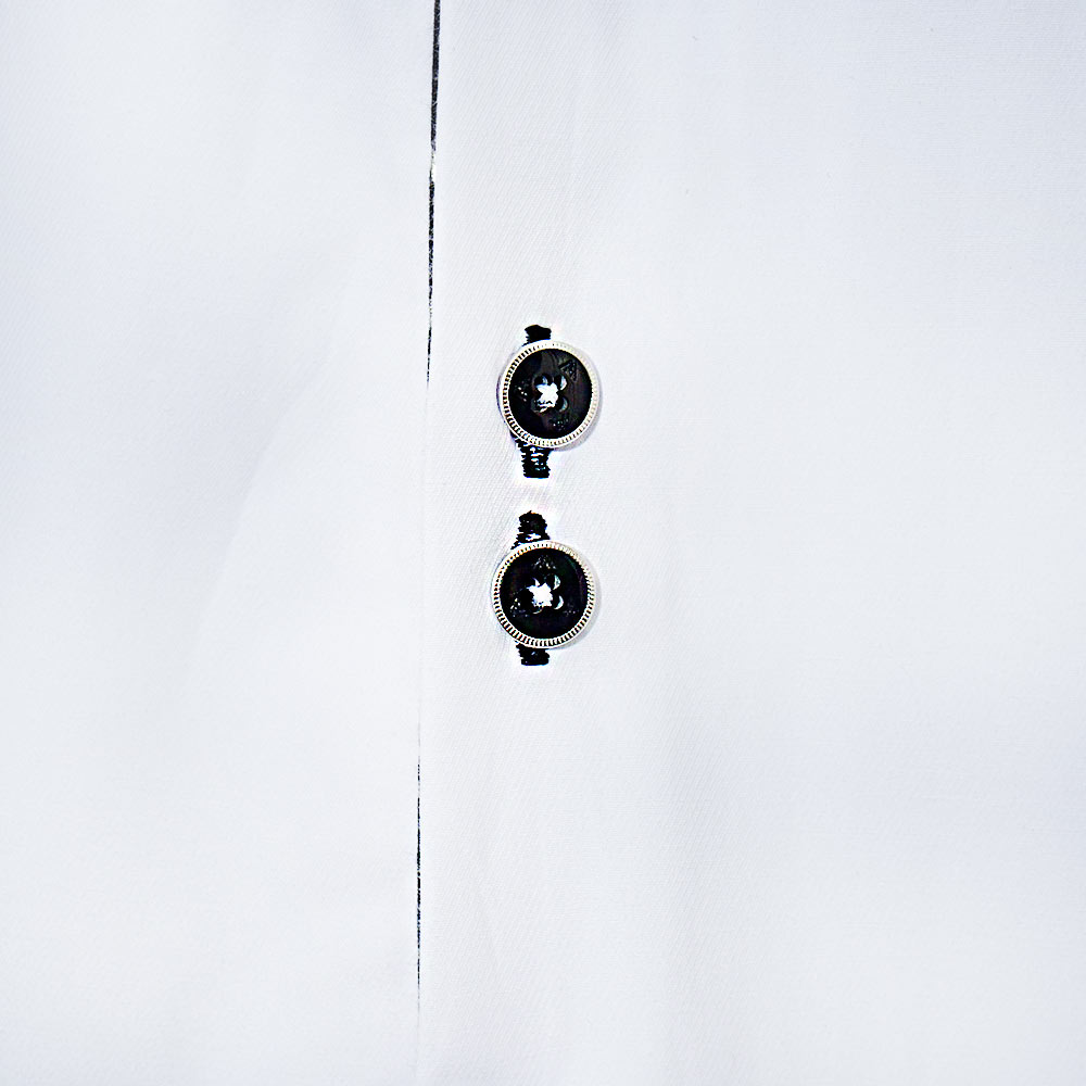 The design details are what set our white with black paisley dress shirts apart. Every shirt showcases a distinctive brass chrome ring double button design, adding a polished and sophisticated accent. The buttonholes are reinforced with double purl stitching, ensuring long-lasting durability and elegance.
